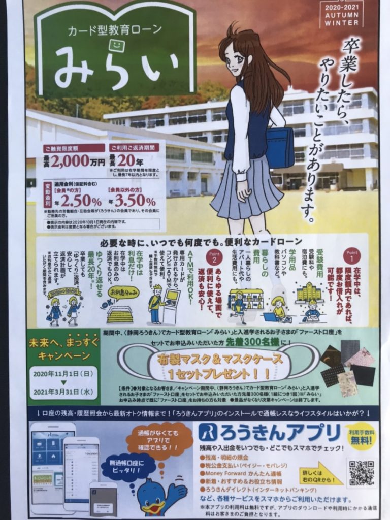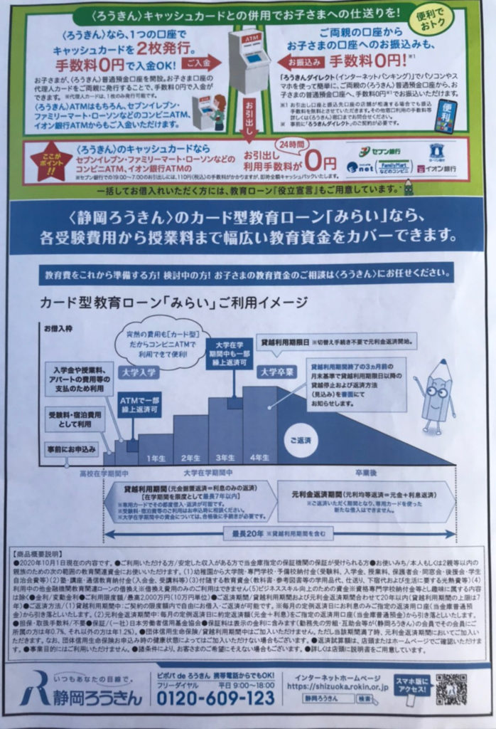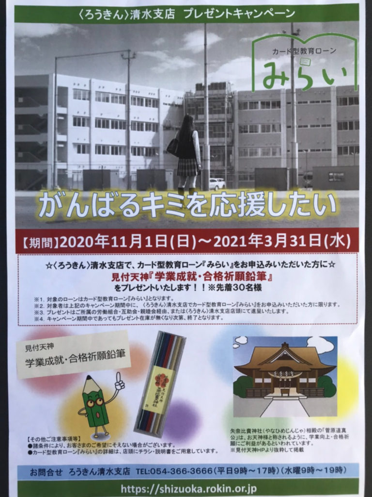 ②「カード型教育ローンみらい」 必要な時にいつでも何度でも限度額内であればその都度お借り入れが可能な教育ローンです。 ご利用ご返済期間が最長20年間なのでゆっくり返済することができます。(ご利用期間は最長7年以内) 先着30名様に見付天神『学業成就・合格祈願鉛筆』をプレゼント!