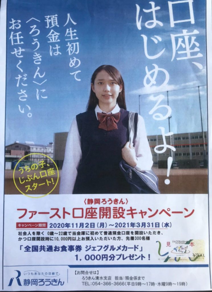 ①「ファースト口座開設キャンペーン」 社会人を除く0歳から22歳でろうきんに初めて普通預金口座を開設して10000円以上お預入れした方が対象になります。先着300名様に『全国共通お食事券』1000円分プレゼント!お子さまの初口座にぜひ!